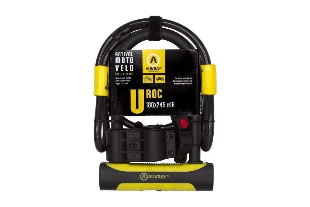 Le combo antivol et câble en acier tressé Auvray U Roc vous permettra de sécuriser votre vélo ainsi que ses roues à un point fixe.