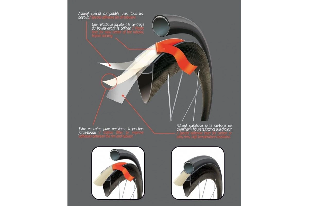 Sa constitution en toile adhésive double-face avec un liner plastifié permettant un centrage facilité, offre une utilisation très facile pour monter les pneumatiques sur jantes aluminium et carbone.