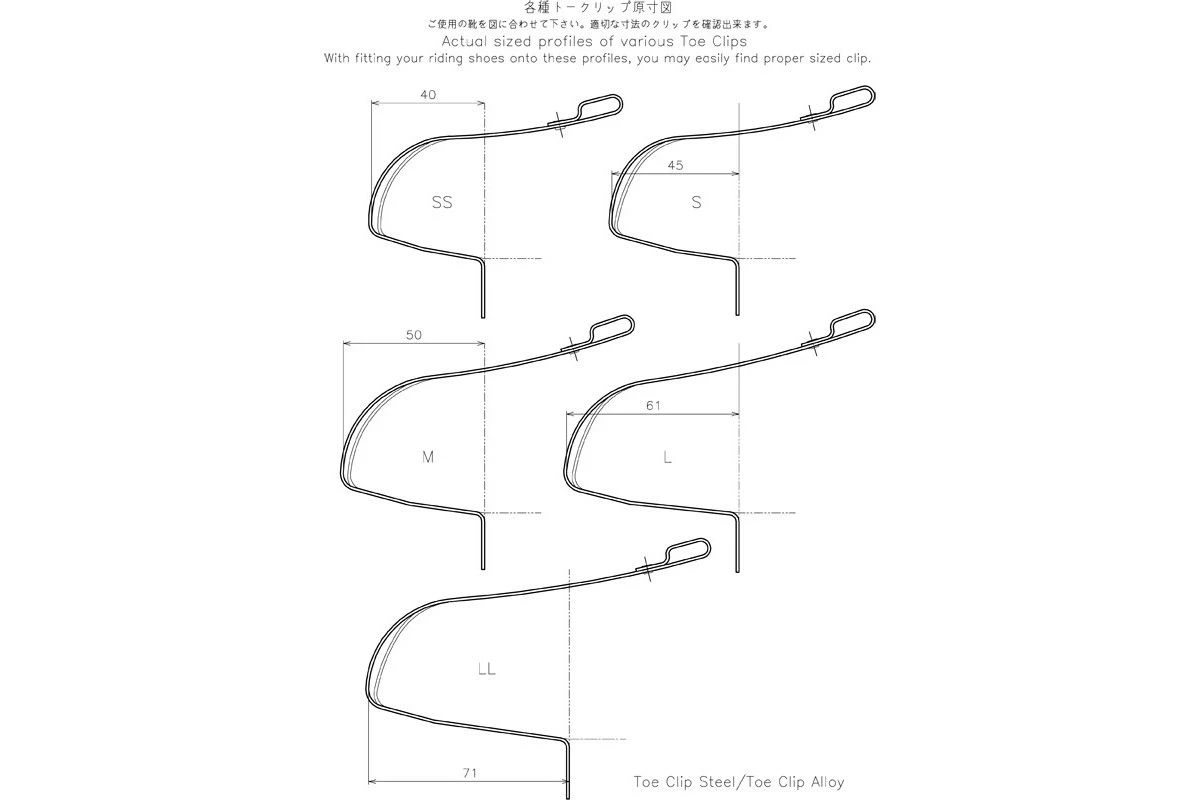 Spécifications détaillées des cale-pieds en acier et cuir MKS Toe Clip NJS :