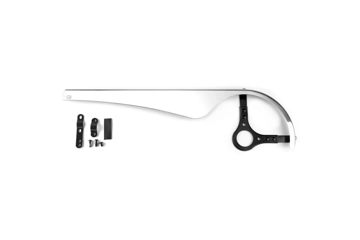 En aluminium poli, il se monte derrière la cuvette du boîtier de pédalier (côté transmission) et sur la base arrière.