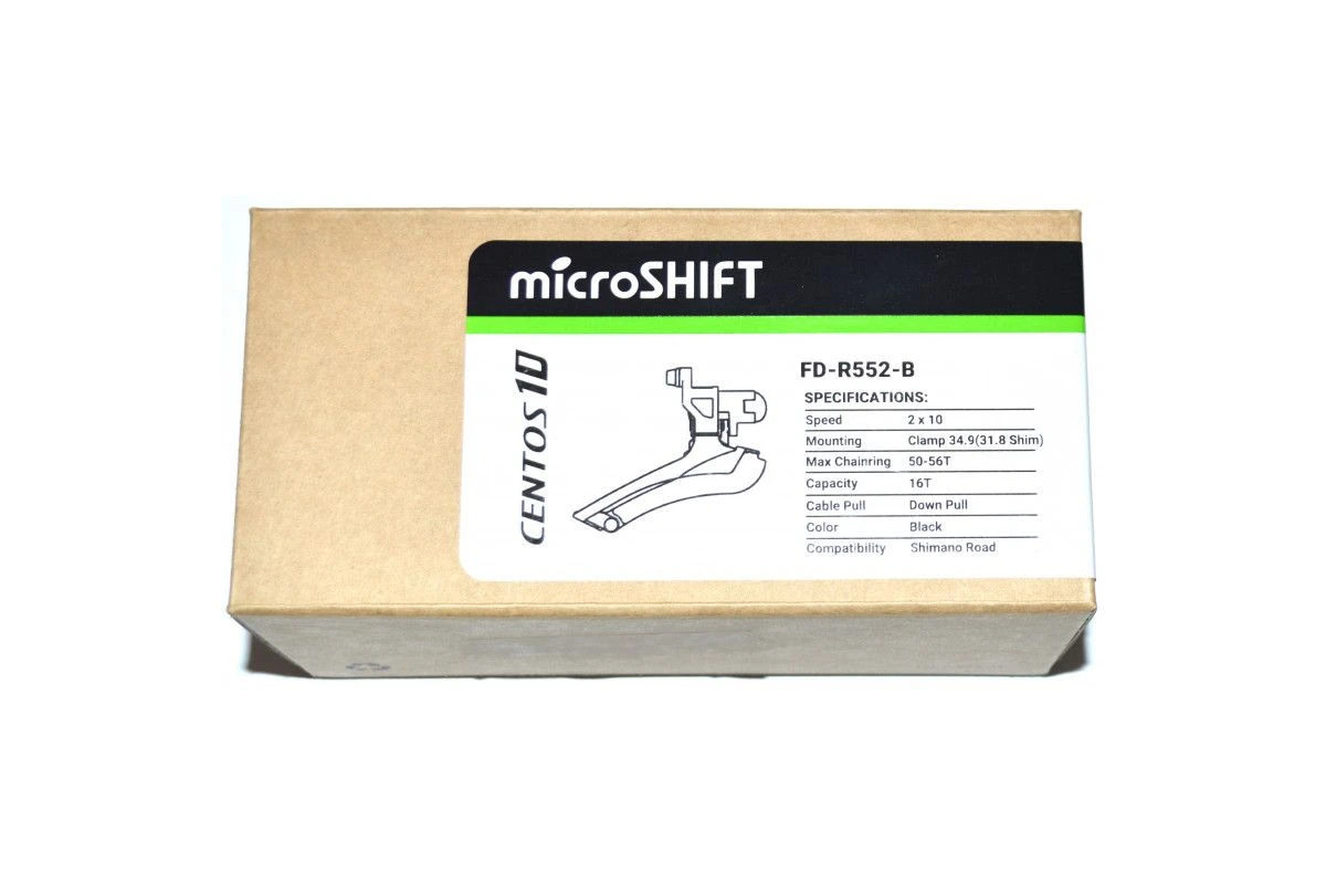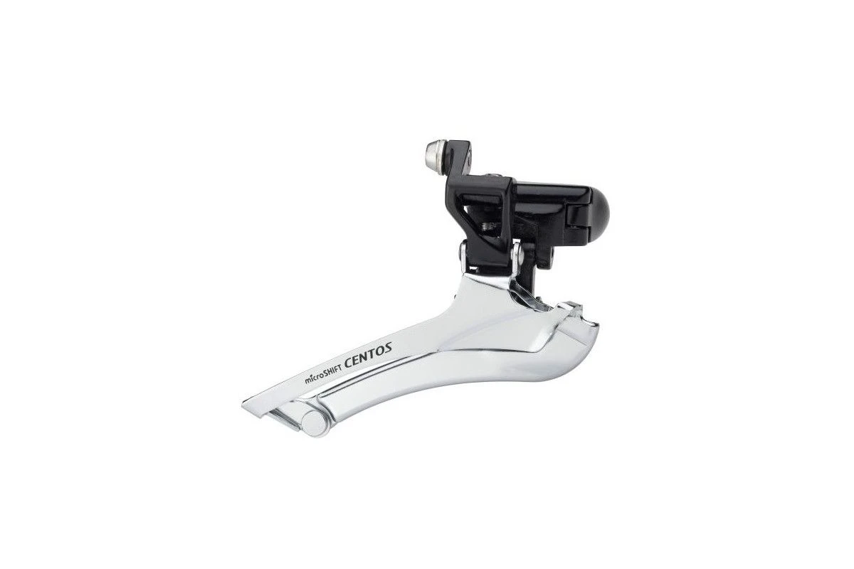 Le dérailleur avant double à collier Microshift à tirage bas Centos est compatible avec les transmissions à double plateau et destiné à une pratique Route.