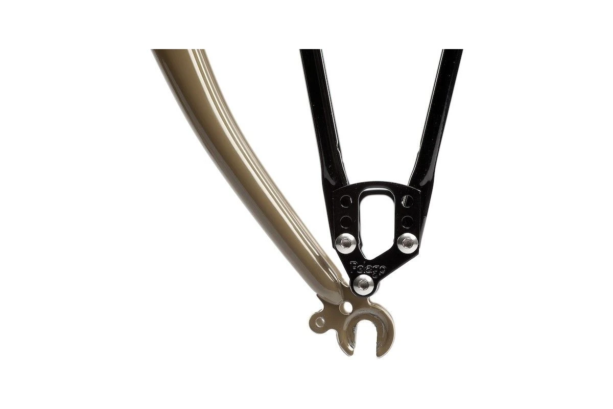 | Fixation | Sur la fourche puis au choix : axe de roue boulonné, œillet de porte-bagages ou œillet de garde-boue |