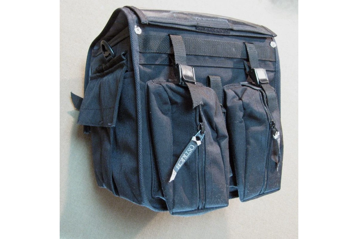La sacoche est équipée d’une poche avant, de deux poches de côté et deux poches zippé arrière.