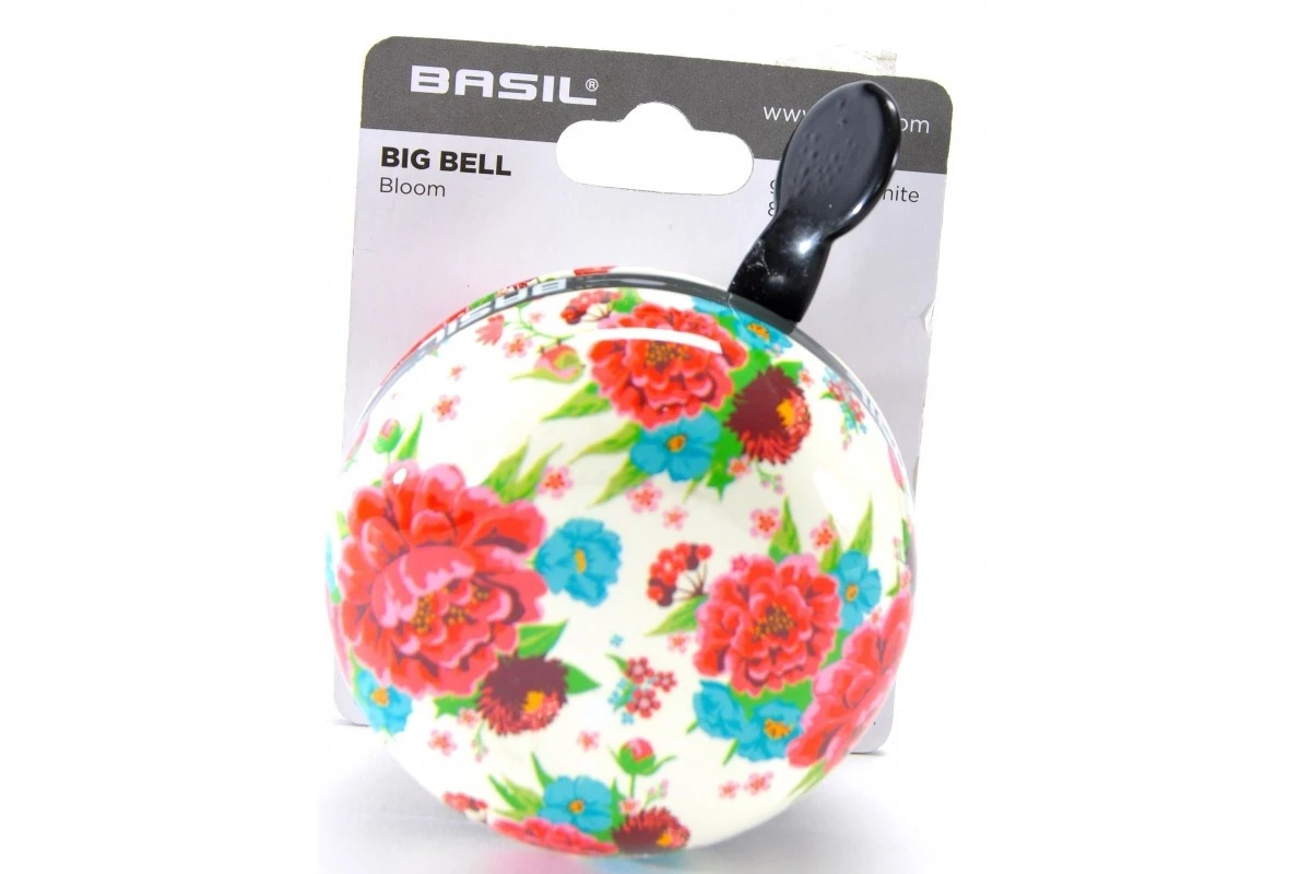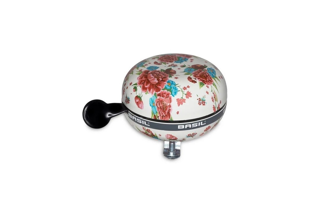 Sonnette BLOOM Blanche de la marque hollandaise Basil, avec sa cloche de 80 mm et son superbe style fleurie cette jolie sonnette conviendra parfaitement aux beaux vélos de ville féminin.