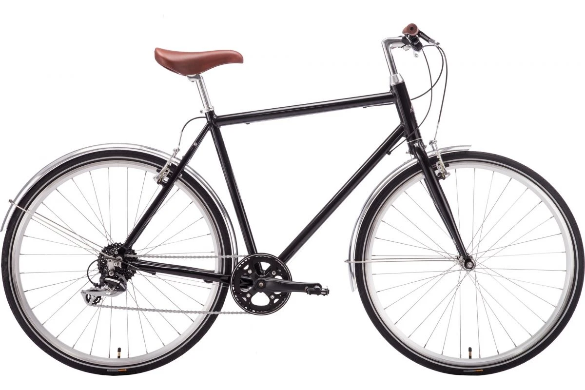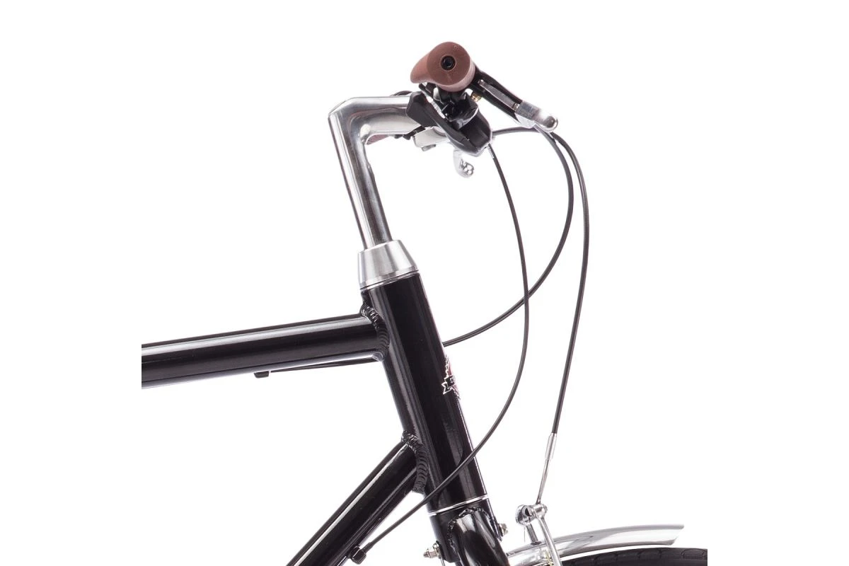 Le Hybrid est un vélo urbain qui dispose d’un look old-school à tomber avec un cadre en acier à tubes ronds et fins, une selle et des poignées marrons et des garde-boues polis.