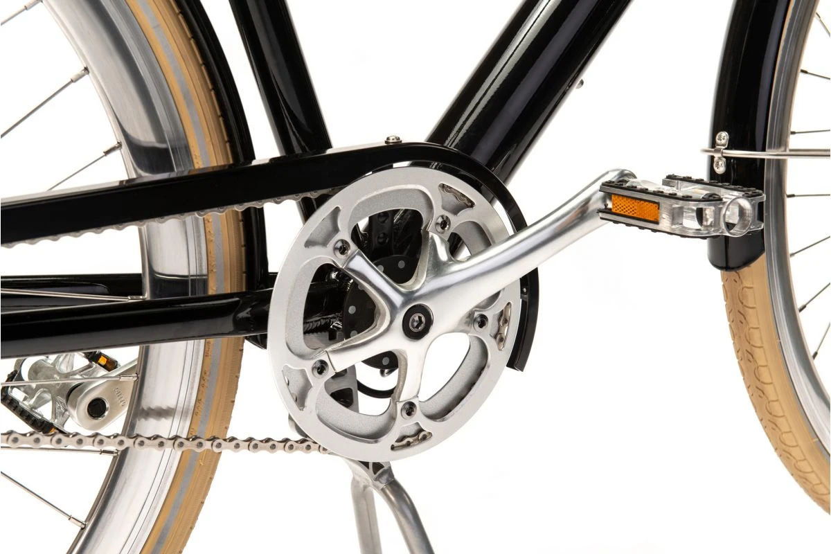 Le choix de sa transmission mono-vitesse est particulièrement sensé et sera complètement approuvé par toutes celles et ceux qui ont eu l’occasion de rouler sur un vélo urbain singlespeed. Le développement choisi est particulièrement polyvalent : Sur le plat, vous n’aurez pas à « mouliner » pour tenir les 25 km/h de moyenne et au démarrage ou en côte, le moteur viendra vous donner un coup de pouce salvateur afin de rouler sans transpirer.